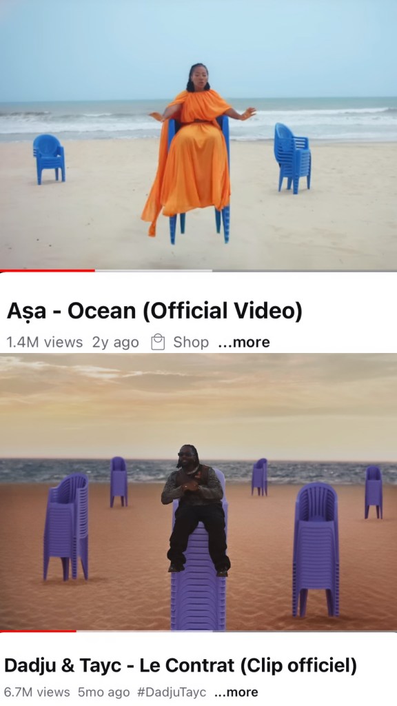 This, however, is nothing compared to what bigger artists experience. Take Asa for example, one of my favorite underrated Nigerian female artist who sang one of the most iconic lines in music history “Akinyele wants to marry wife, he don’t wanna pay the bride price, you better find it!” I woke up today reminiscent of her music so I checked out her track “Ocean” released 2 years ago. Her beach scene was so similar to something I had seen in Tayc & Dadju’s clip “Contract” released 5 months ago. I went back to double check, and BOOM! S*** too similar to be a coincidence. Stop plagiarizing people! Not cool.